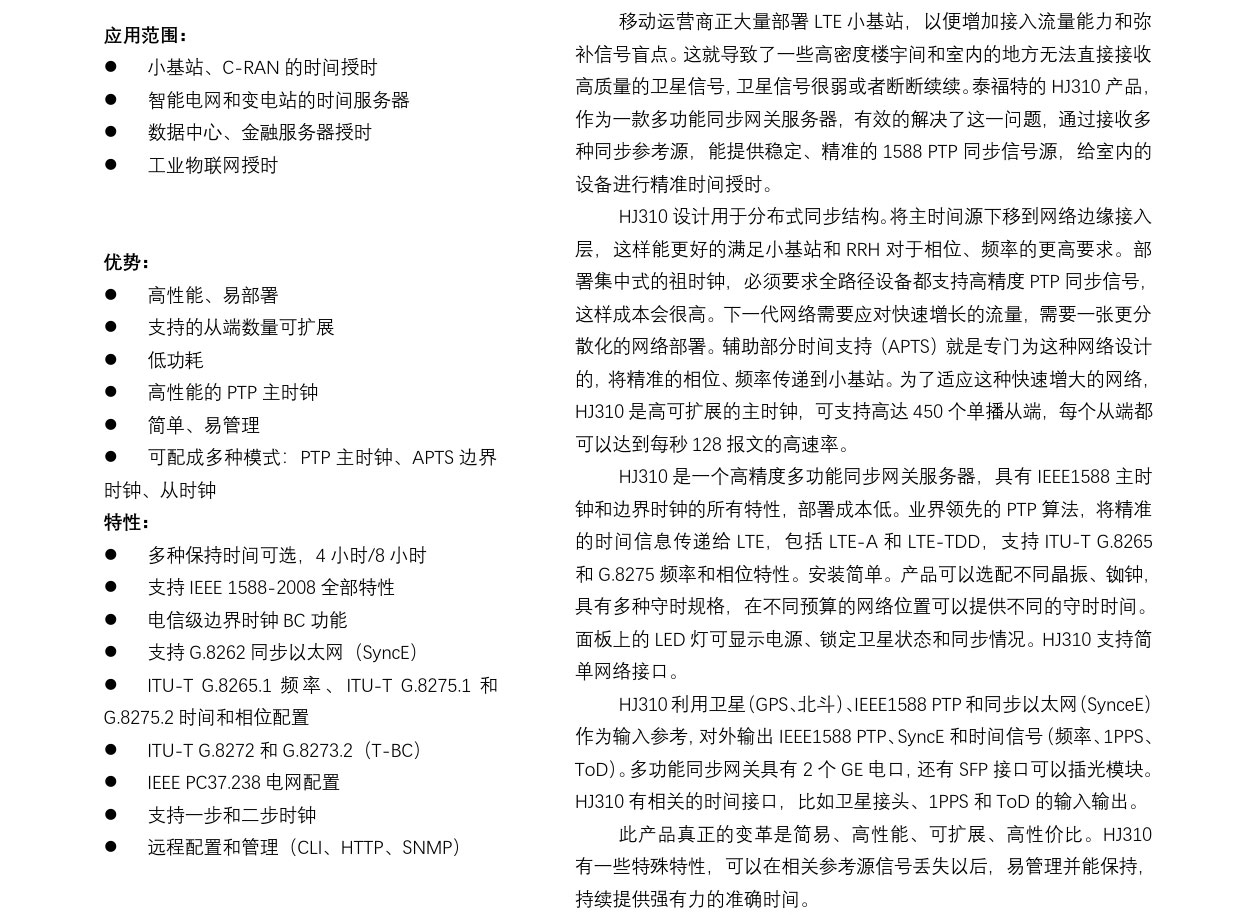 • HJ310設計用于分布式同步結構。將主時間源下移到網絡邊緣接入層,這樣能更好的滿足小基站和RRH對于相位、頻率的更高要求。部署集中式的祖時鐘,必須要求全路徑設備都支持高精度PTP同步信號,這樣成本會很高。下一代網絡需要應對快速增長的流量,需要一張更分散化的網絡部署。...