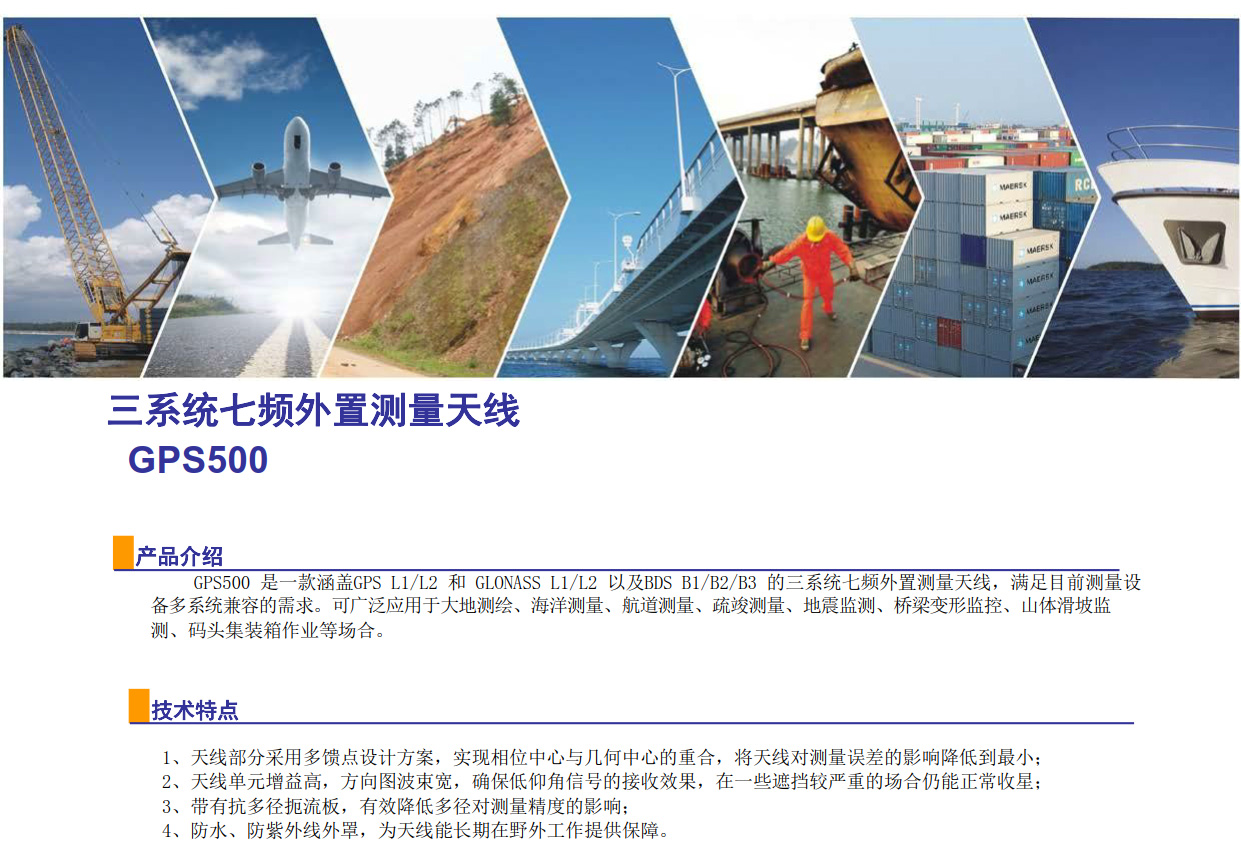 • GPS500 是一款涵蓋GPS L1/L2 和 GLONASS L1/L2 以及BDS B1/B2/B3 的三系統七頻外置測量天線,滿足目前測量設備多系統兼容的需求。可廣泛應用于大地測繪、海洋測量、航道測量、疏竣測量、地震監測、橋梁變形監控、山體滑坡監測、碼頭集裝箱作業等場合。...